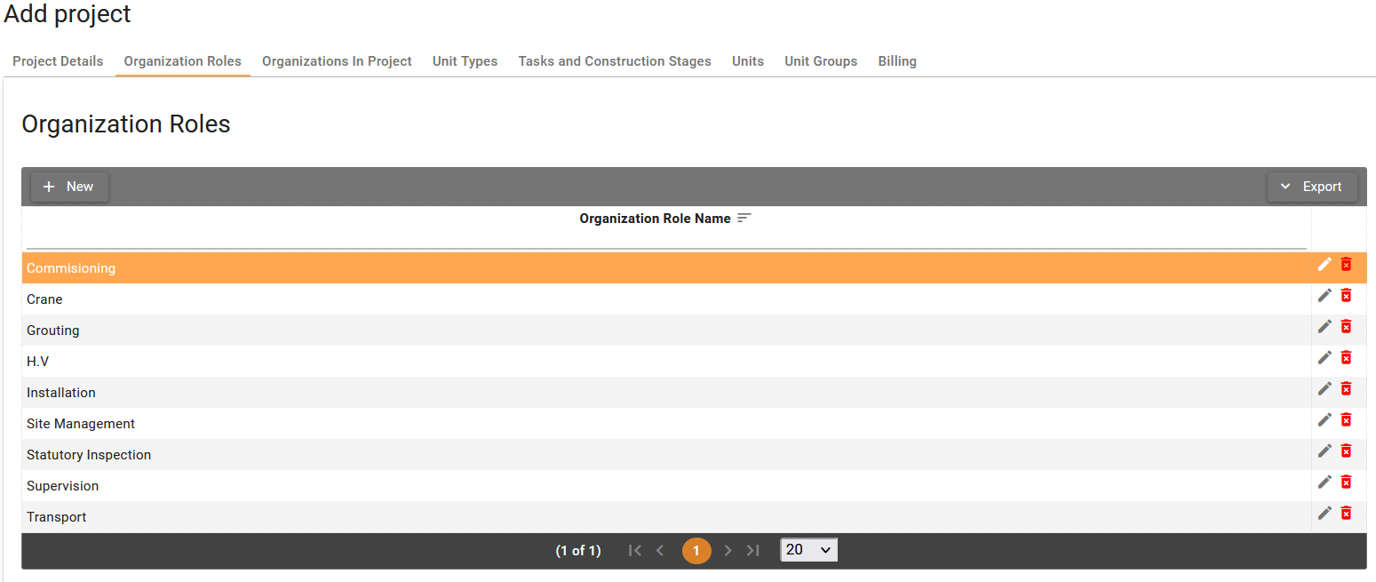Define organization roles in the project e.g. Installation, Mechanical, Crane. Later, roles will be assigned to the organizations involved in the project. Additionally construction stages and tasks required to complete the project will be redistributed across roles.