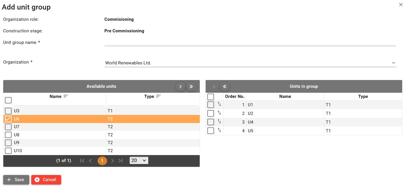 Click Add unit group button to open a dialog allowing to add unit group and assign, select organization and assign units.