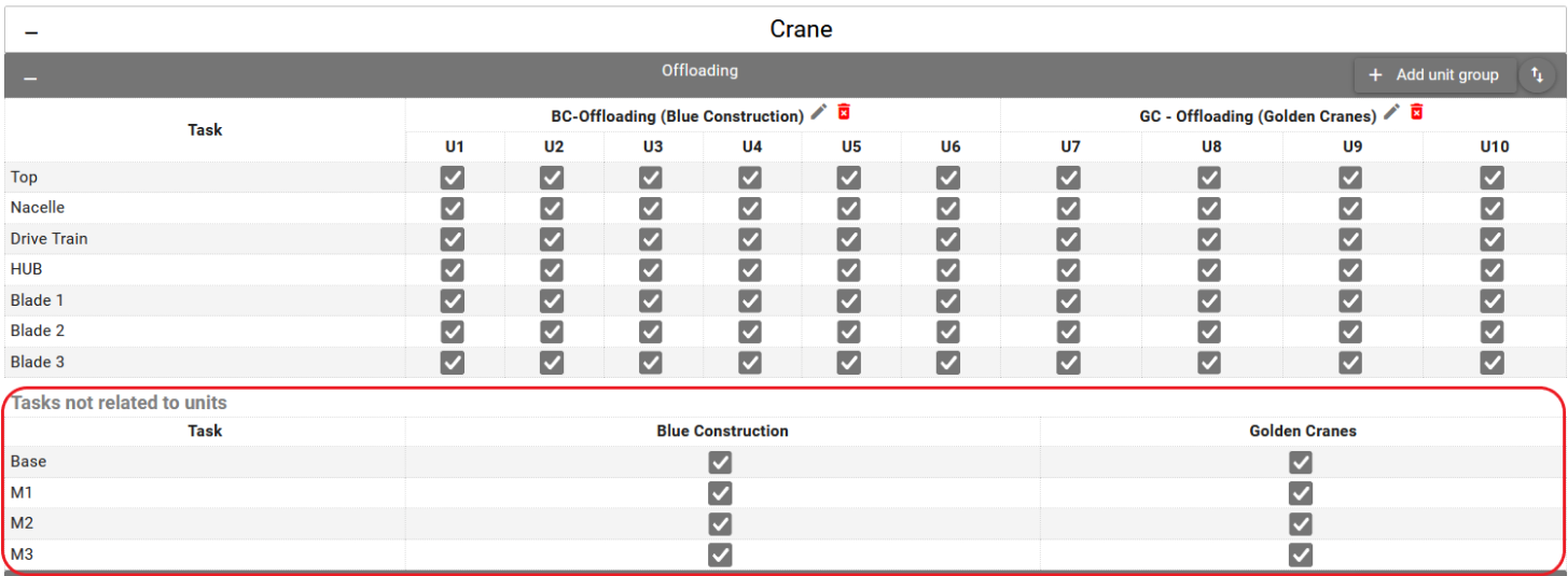 When creating the project the tasks on unit groups screen are initially not related to any units. You need to add unit groups and redistribute the units.
