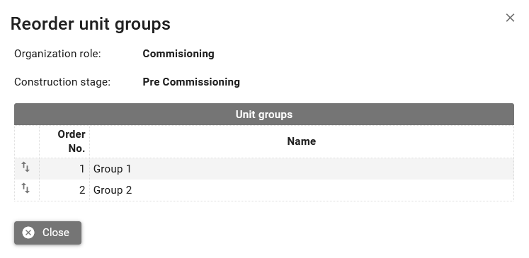 Drag and drop unit groups rows in the dialog to reorder them.