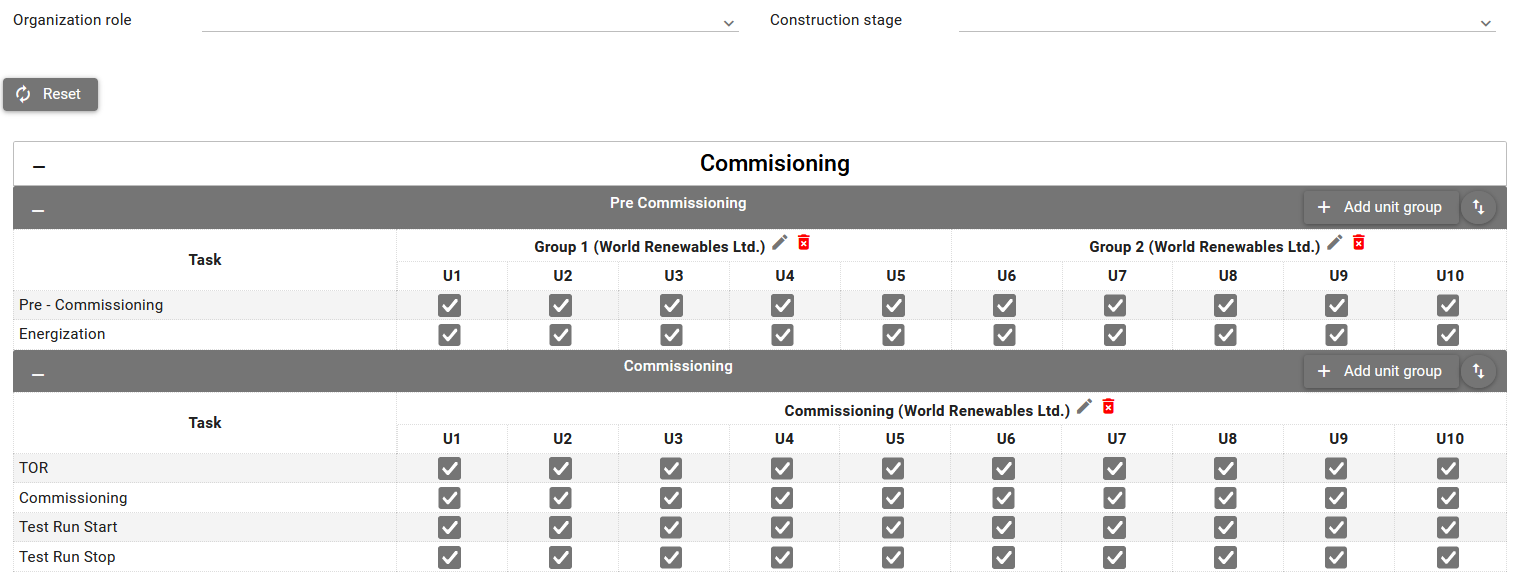 In most cases only one organization is working on all tasks for units in construction stage, hence one unit group will be created per construction stage. But in larger projects, there are often few organizations with the same role and the construction of units is shared. In that case you can create unit group per organization within construction stage to redistribute the units. Multiple unit groups can also be created for one organization within the same construction stage, e.g. when there is more than one crane working on the same construction stage, in that case you can create separate unit group for each of them. Later that will allow you to easier review statistic and compare performance of the cranes.