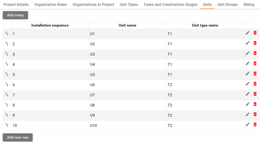 Add units to be constructed within the project and assign a unit type to each of them. Units can be created one by one or many at once*.*