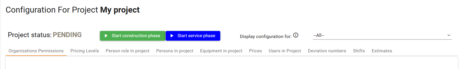 After creating the project and completing its structure, you can start configuring it on project configuration screen by adding persons, equipment, creating prices, estimates, deviations and give permission to review your reports. You can also start and stop the project on that screen. If you are subcontractor, you will be able to configure your part of the project.
