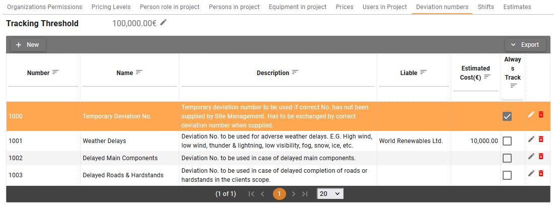 Deviation numbers screen allows to define deviations and estimates for them, enable/disable tracking, define tracking thresholds. All organizations in the project see all deviations defined in the project, but only the project owner is able to create new deviations. All organizations can add their own estimated cost to the deviation, these estimates will not be visible for other companies. Later the deviations can be used when creating stand by and extra work activities, to identify the cause of them. The deviation numbers cost can be tracked on Track deviations and Deviation details reports, they are also visible on the Project overview report.