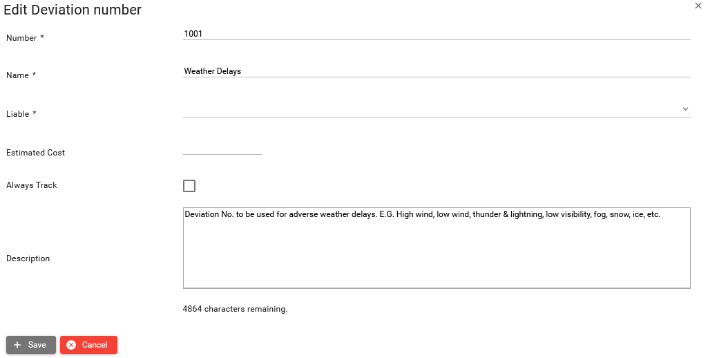 Provide estimated cost of the deviation number. Later when hourly cost registered against the deviation will exceed the estimate, the deviation will appear on the Track deviations report.