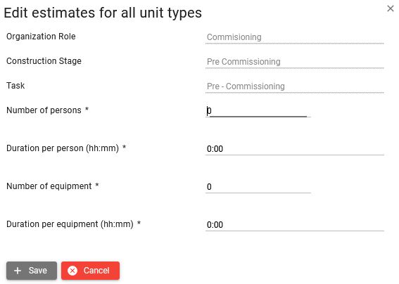 On the edit dialog you can provide the estimates for your resources, similar to editing inline in the estimates table. After saving the estimates will be applied to all unit types for the selected task.