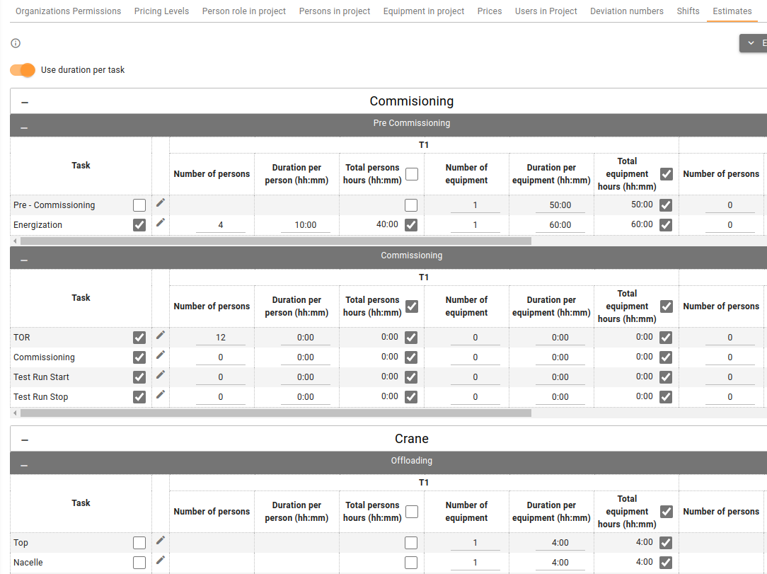 By default Use duration per task is enabled. This allows you to estimate the duration of your tasks and specify the number of resources you plan to allocate to each task. The system will then automatically calculate the total number of resource hours required for the task.