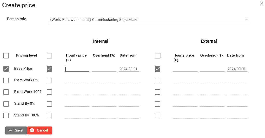 Select resource - When dialog is opened from Person role or Equipment screen, then you need to select your resource from the dropdown in order to see the pricing levels for the resource.