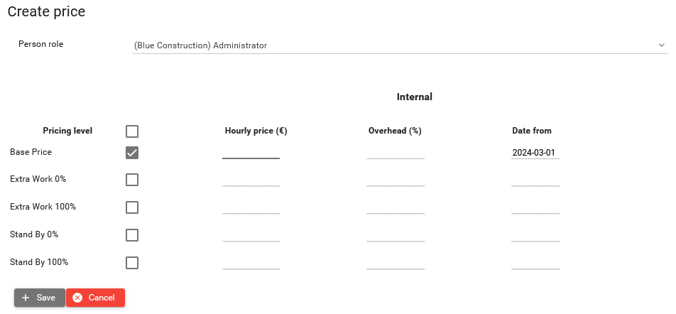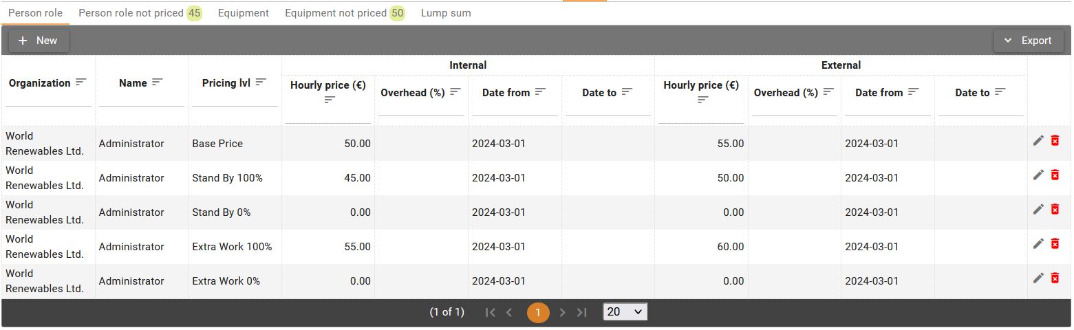 Person role and Equipment tabs are very similar, hence in this document describes Person roles screen, but the same principles regarding creating deleting and reviewing prices applies to the Equipment screen.