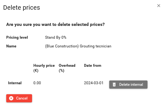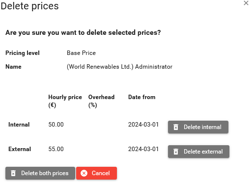 The dialog differs for project owners and subcontractors. Project owner can delete both internal and external prices, subcontractor and client only internal price.
