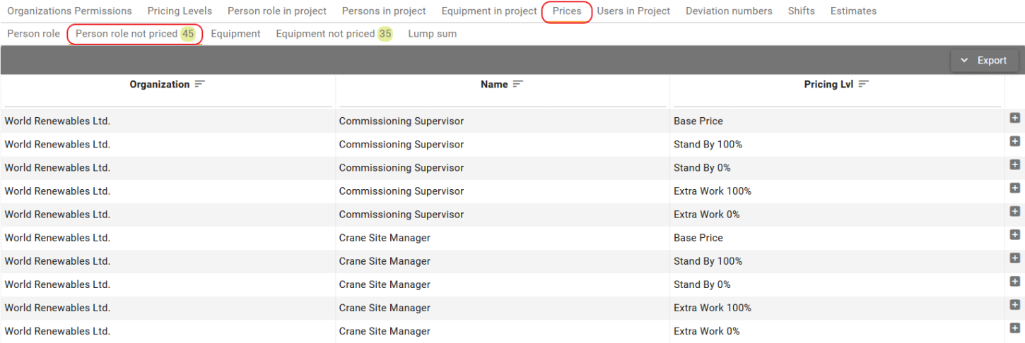 Person role not priced -displays a list of person roles and pricing levels for which there is no price defined yet. This tab is designed to create new prices in bulk.