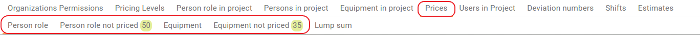 Person role/Equipment not priced tabs