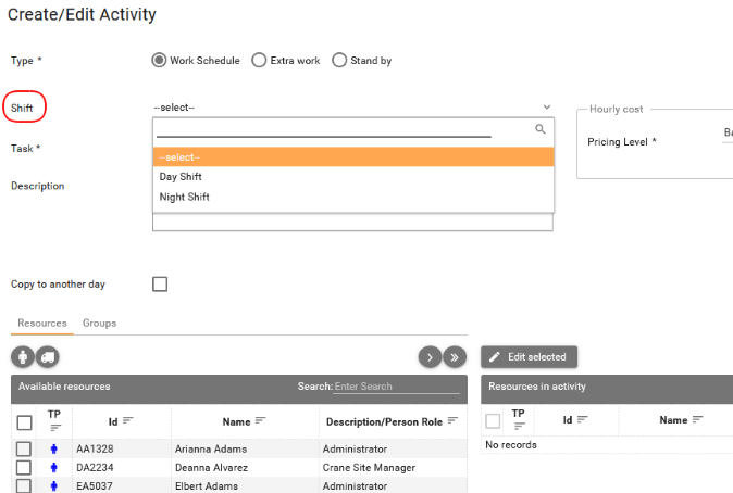 The shifts screen allows to define the shifts in the project for his organization i.e.: Day Shift, Night Shift etc. The shift can later be selected when registering activity on the daily report.